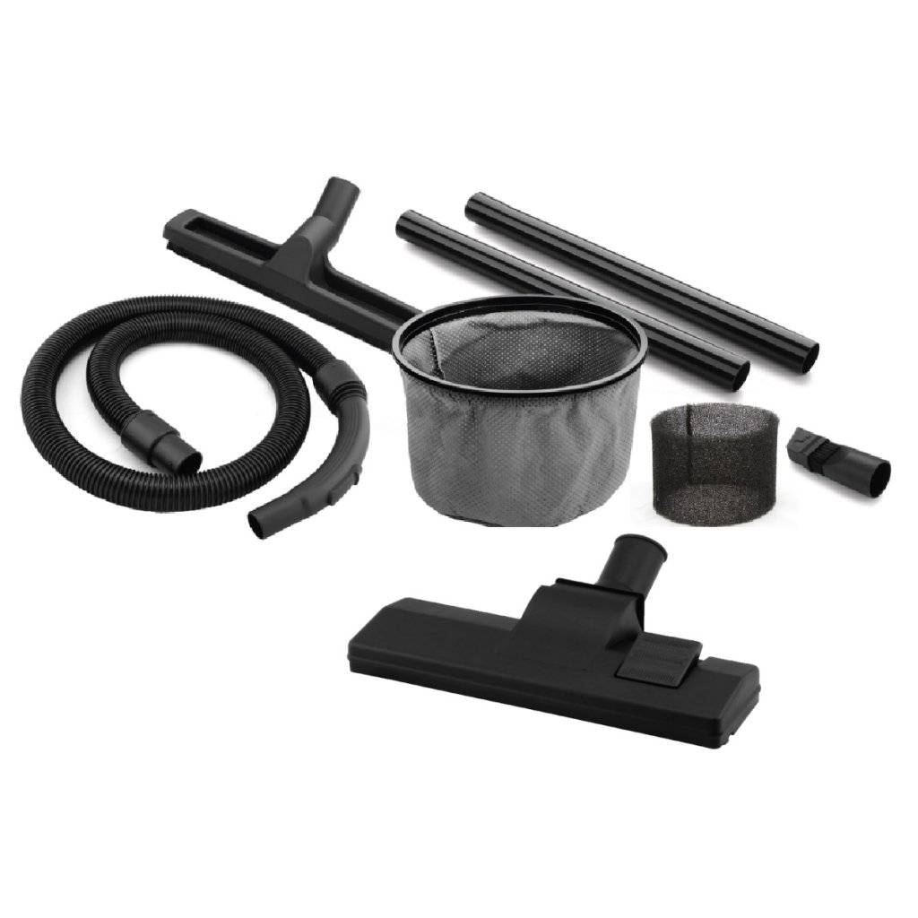 3x plastová trubice (40cm) 1x plastová hadice (1,5m) 1x nástavec na mokré čištění podlah 1x podlahová hubice 1x kombinovaný kartáč 4x kolečka 1x látkový filtr 1x houbový filtr