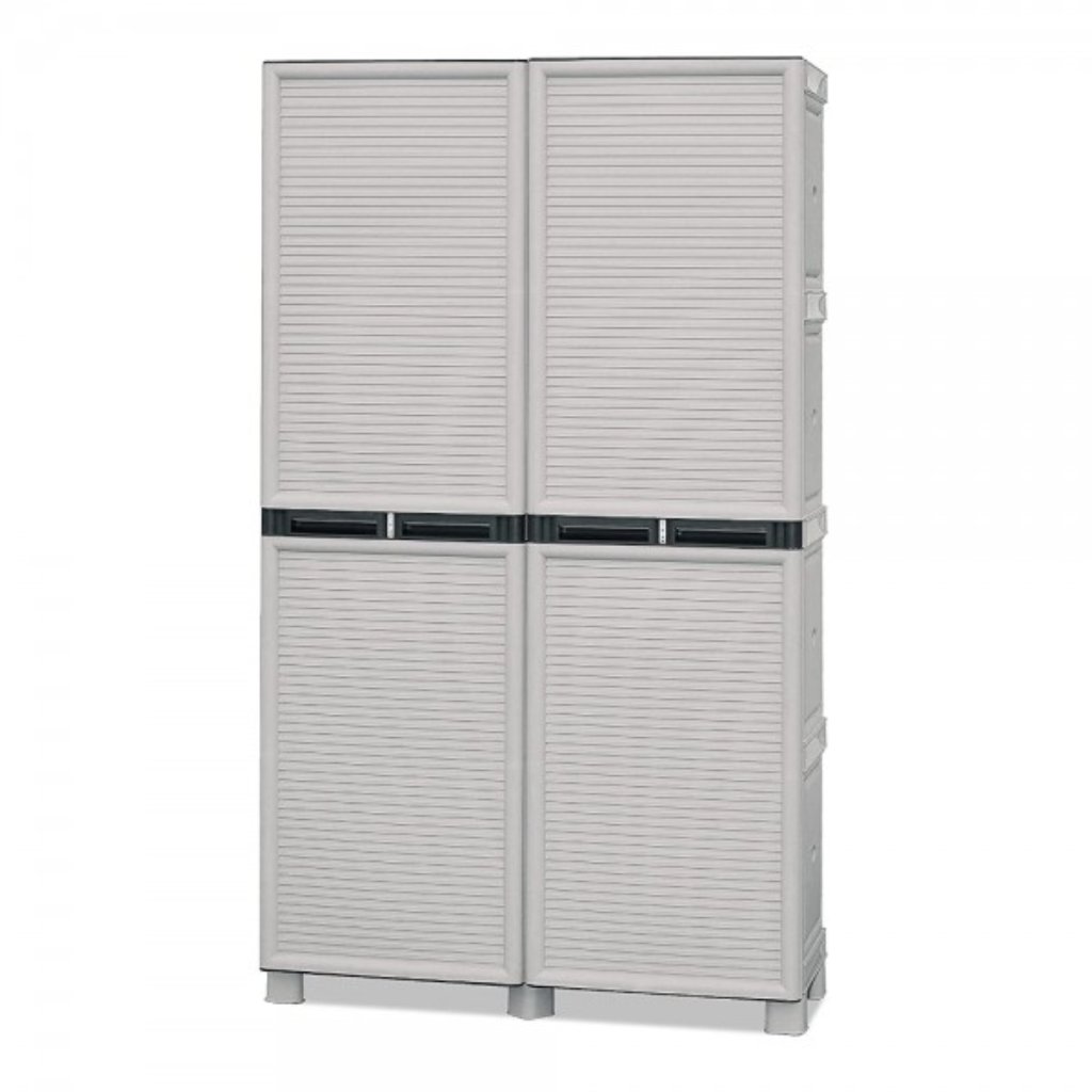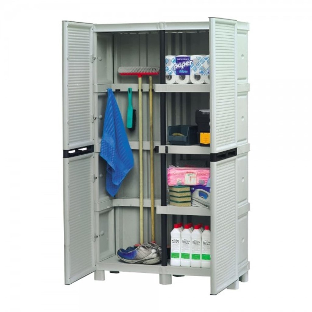 Skříň je dělená se 3 policemi, stabilitu zajišťují nastavitelné nožičky, vyrobena z propylenu velmi odolného protichladu a nepříznivému počasí, olejům a rozpouštědlům, zvýšená odolnost proti nárazům, ideální do sklepa, garáže, dílny, na balkon, terasu či do chodby, rozměry skříně 100 x 39 x 172 cm, šedá