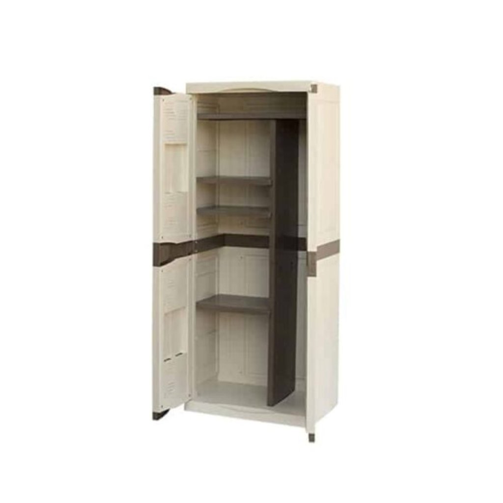 Skříň dělená se 4 policemi o nosnosti 25 kg, možnost dodatečného uzamčení, vyrobena z propylenu velmi odolného protichladu a nepříznivému počasí, olejům a rozpouštědlům, zvýšená odolnost proti nárazům, ideální do sklepa, garáže, dílny, na balkon, terasu či do chodby, rozměry skříně 70 x 47 x 184 cm, béžová/hnědá.