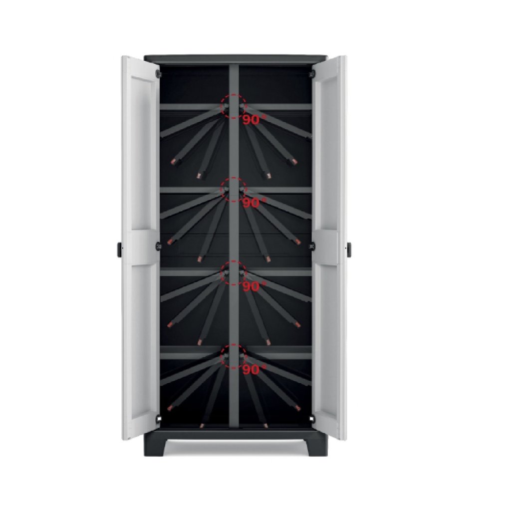 Koupí této skříně získáte univerzální prostor pro ukládání věcí a to i v exteriéru díky její odolnosti proti vodě. Navíc můžete jednotlivé police sklopit o 90 ° a vytvořit prostor přímo na míru ukládaných věcí. Nerovný povrch není problémem, protože má výškově nastavitelné nohy.