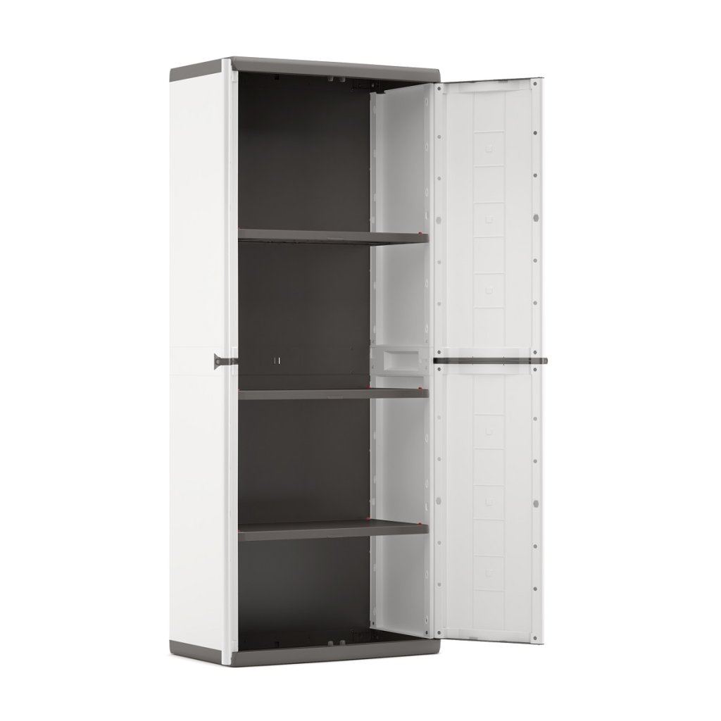 Pracovní skříň Jolly High Cabinet je z plastu a určená pro dílenské účely, ale je vhodná do sklepů, garáží. Můžete ji využít také v pracovnách i kancelářích. Vnitřní uspořádání skříně: tři police, každá o nosnosti až 15 kg. Díky plastovému provedení nerezaví. Dále je vybavena očkem pro připevnění visacího zámku - pro zabezpečení jejího obsahu. Rozměry skříně jsou 68×166×39 cm. Snadná montáž.