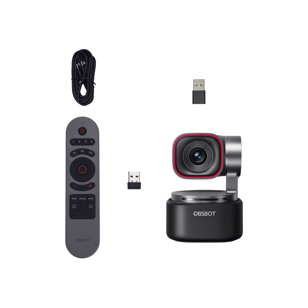 Sada obsahuje OBSBOT Tiny Smart Remote 2, který kombinuje funkce dálkového ovládání kamery a prezentéru. S jedním zařízením můžete ručně ovládat pohyb gimbalu, zoom a přednastavené pozice snímků a také okamžitě aktivovat klíčové funkce AI, jako je sledování osob, režim zoomu, režim Desk Mode a sledování rukou. Dálkové ovládání také umožňuje pohodlné ovládání prezentací a nabízí tlačítka pro změnu snímků, režim celé obrazovky a laserové ukazovátko, což z něj činí praktický nástroj pro školení, přednášky a živé prezentace. Fyzická tlačítka a ergonomické rozložení umožňují intuitivní ovládání kamery a prezentace i během dynamických prezentací, bez nutnosti použití myši, klávesnice nebo aplikace.