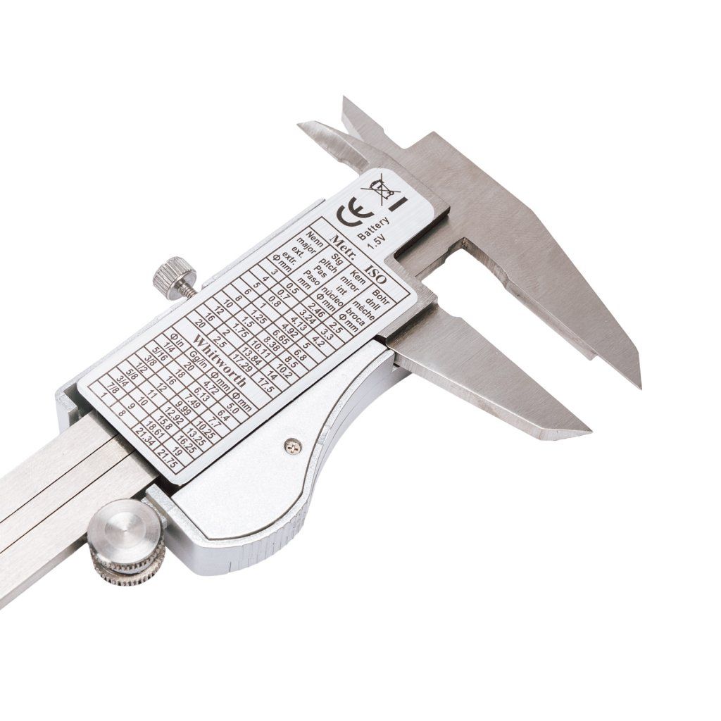 Digitální posuvné měřítko slouží pro přesné měření vnitřních a vnějších rozměrů (hloubky) do 150 mm, možnost nastavit nulu. LCD display v kovové schránce. Velké, čitelné číslice s rozlišením 0,01mm. Na zadní straně měřidla je pomocná tabulka pro měření závitu. Převod mezi imperiální a metrickou soustavou.