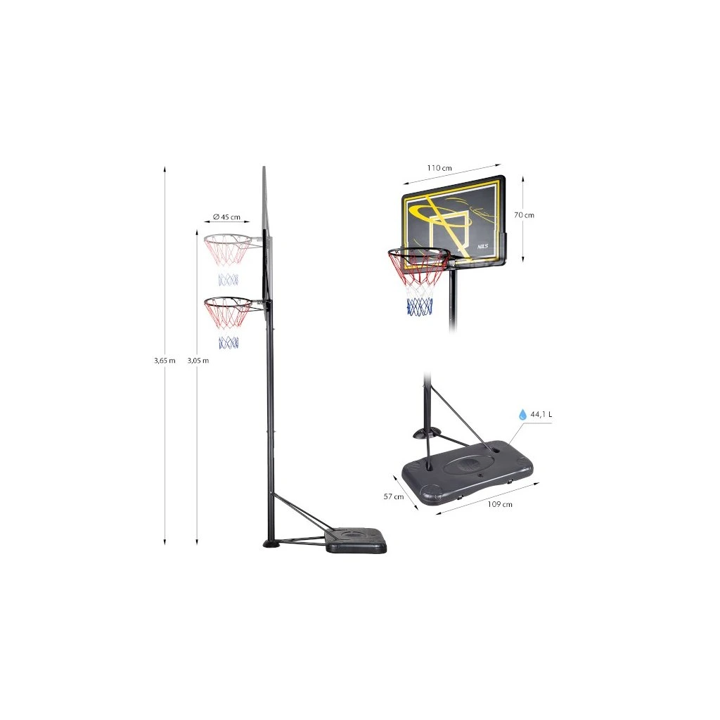 ZDK019E je mobilní volně stojící koš, který se vám bude hodit při individuálním tréninku nebo při skupinové hře. Nastavitelná výška umožňuje přizpůsobit koš vzrůstu a schopnostem uživatele. Výrobky značky NILS jsou především z nejkvalitnějších materiálů. Deska je vyrobena z odolného materiálu PVC a ve spojení s ocelovou obručí zaručují dlouhou životnost. Transportní kolečka umístěné na stabilní základně, o objemu 44 litrů, zajišťují naprostou mobilitu a stabilitu výrobku. Základna se plní pískem nebo vodou. Každý prvek konstrukce je odolný vůči povětrnostním vlivům.